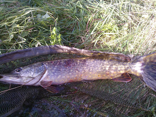 In my little lure box I also have a nice set of tiny ultra lite rubber lures so on went a roach style one. Soon enough I felt the braid tighten and I hit into a fish, I don't think it realised quite what was going on at first as it just came in as I wound, that was until it got almost to the bank, it then decided to go on a bit of a run. The fish was soon subdued though, the medium strength rod and 35lb braid easily saw to that. After a bit of head shaking on the surface the fish was soon in the net. My first proper lure caught pike, not a monster, 5lb+ or so but much bigger than my only other lure caught pike of around a pound!